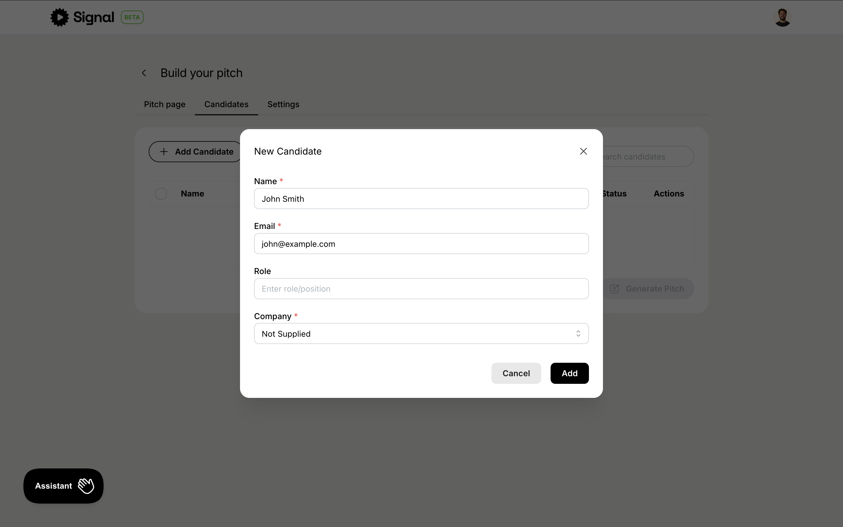 Once you have entered all the necessary details, click add to associate the candidate with the pitch.