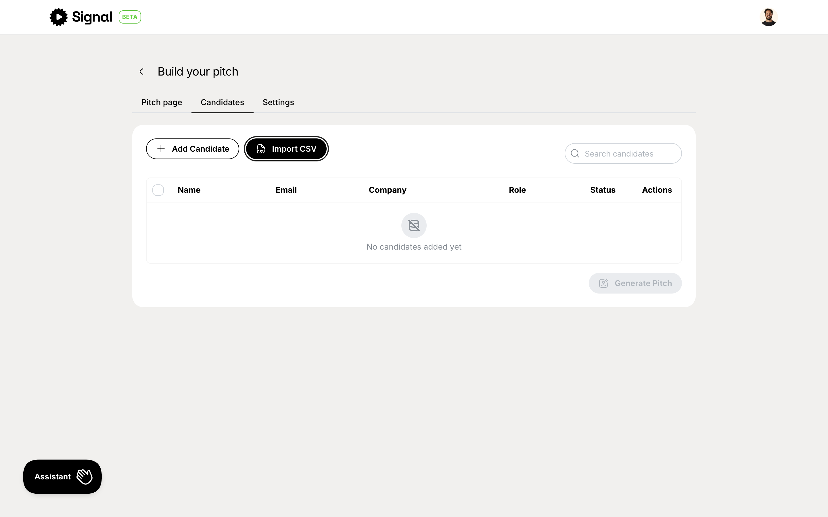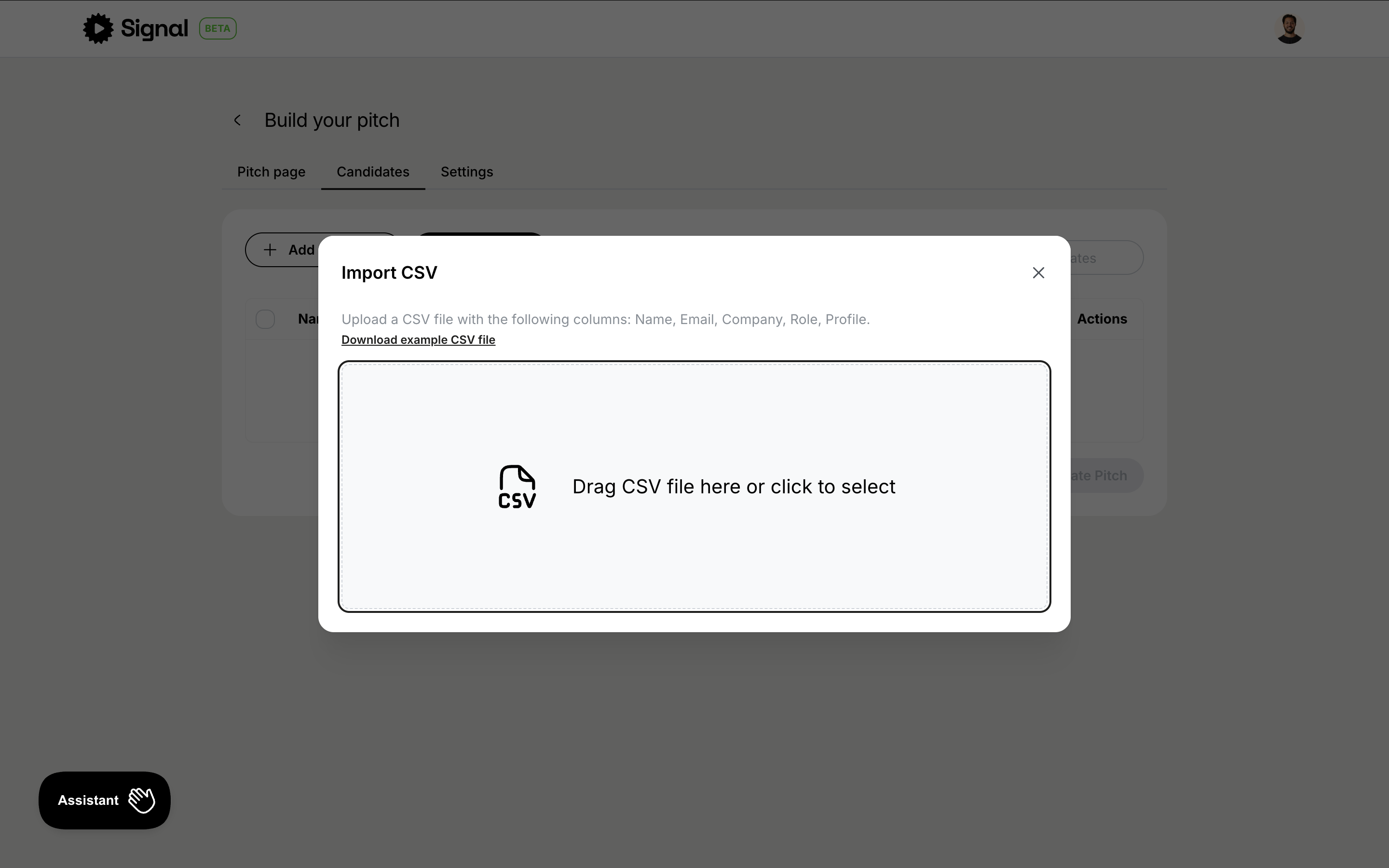 To upload a list of candidates, open the candidates tab within your pitch, and then click the import CSV button.