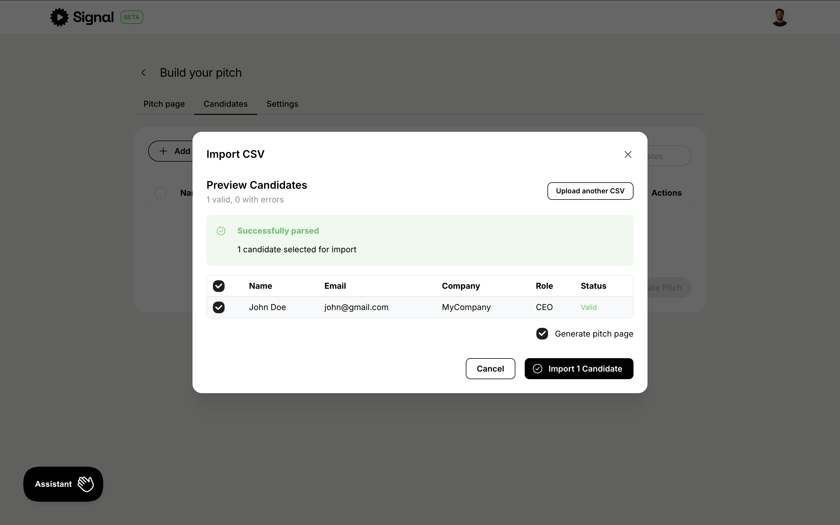 Once the CSV is added, Signal displays an import preview where you can confirm the candidates you want to include.