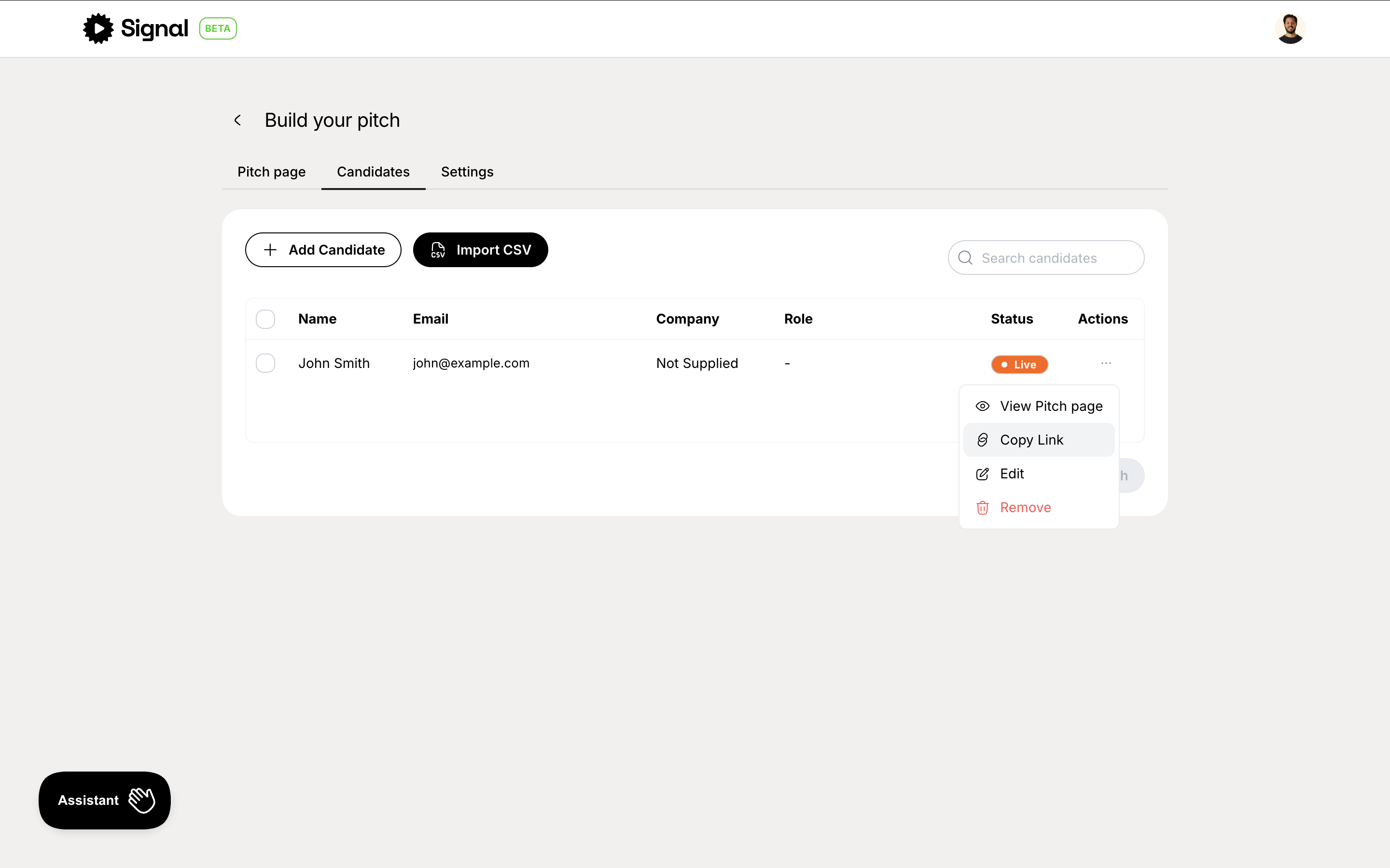 Once the generation has finished, the status for the candidate will change from draft to live and you can copy the link to the pitch page.