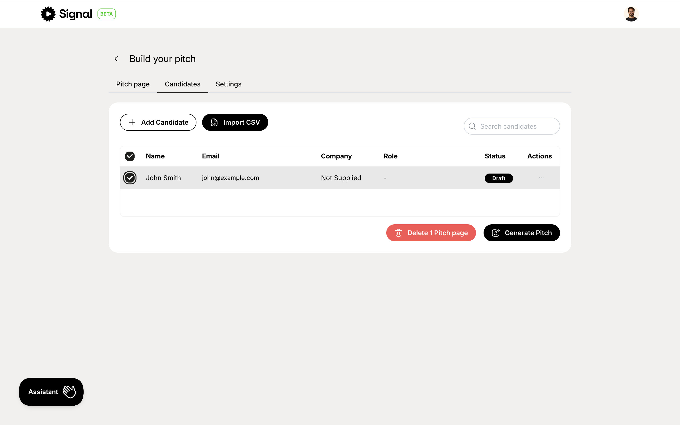 To generate your pitch pages, open the candidates tab in your pitch, and then select the candidates you need to generate pitch pages for.