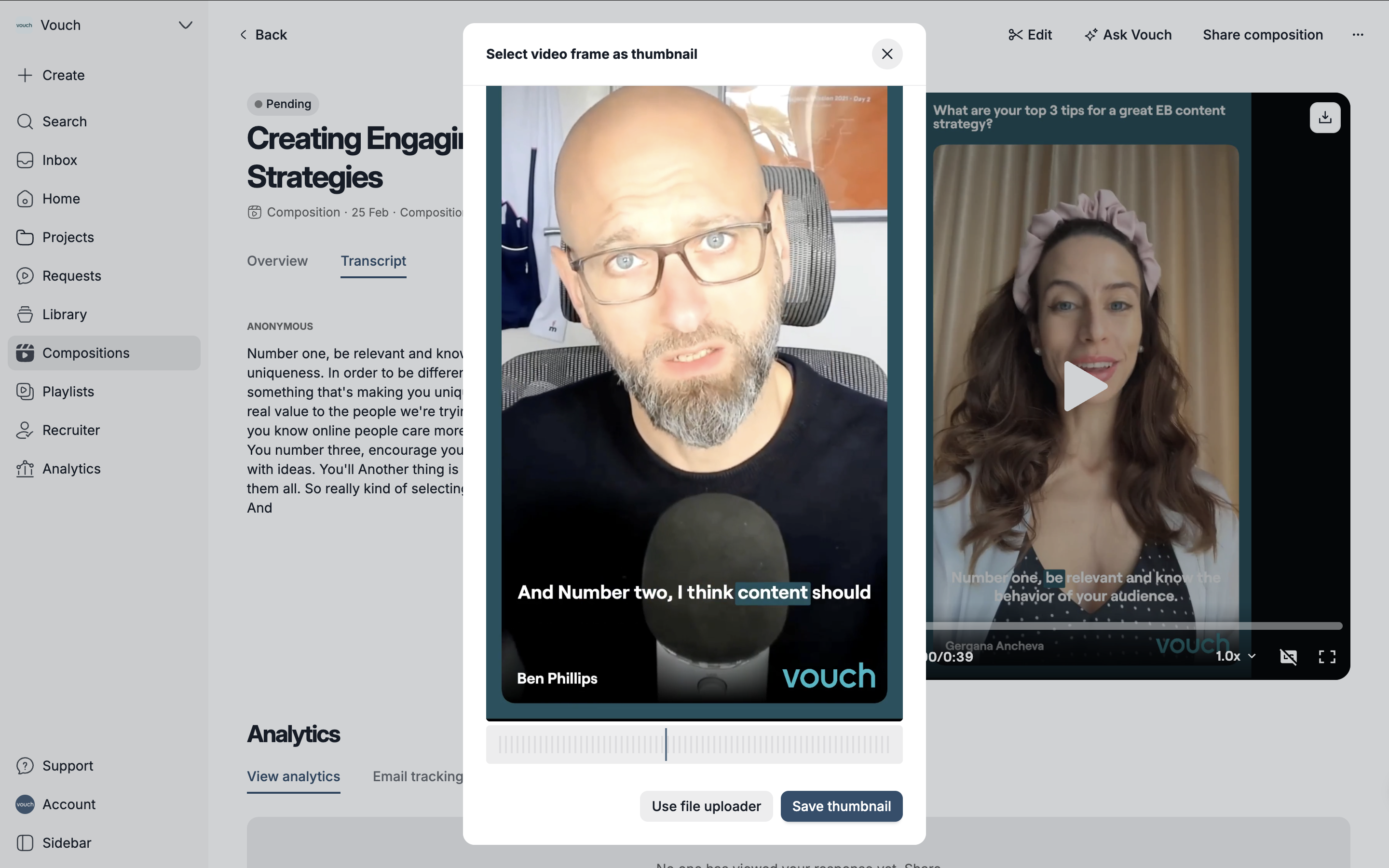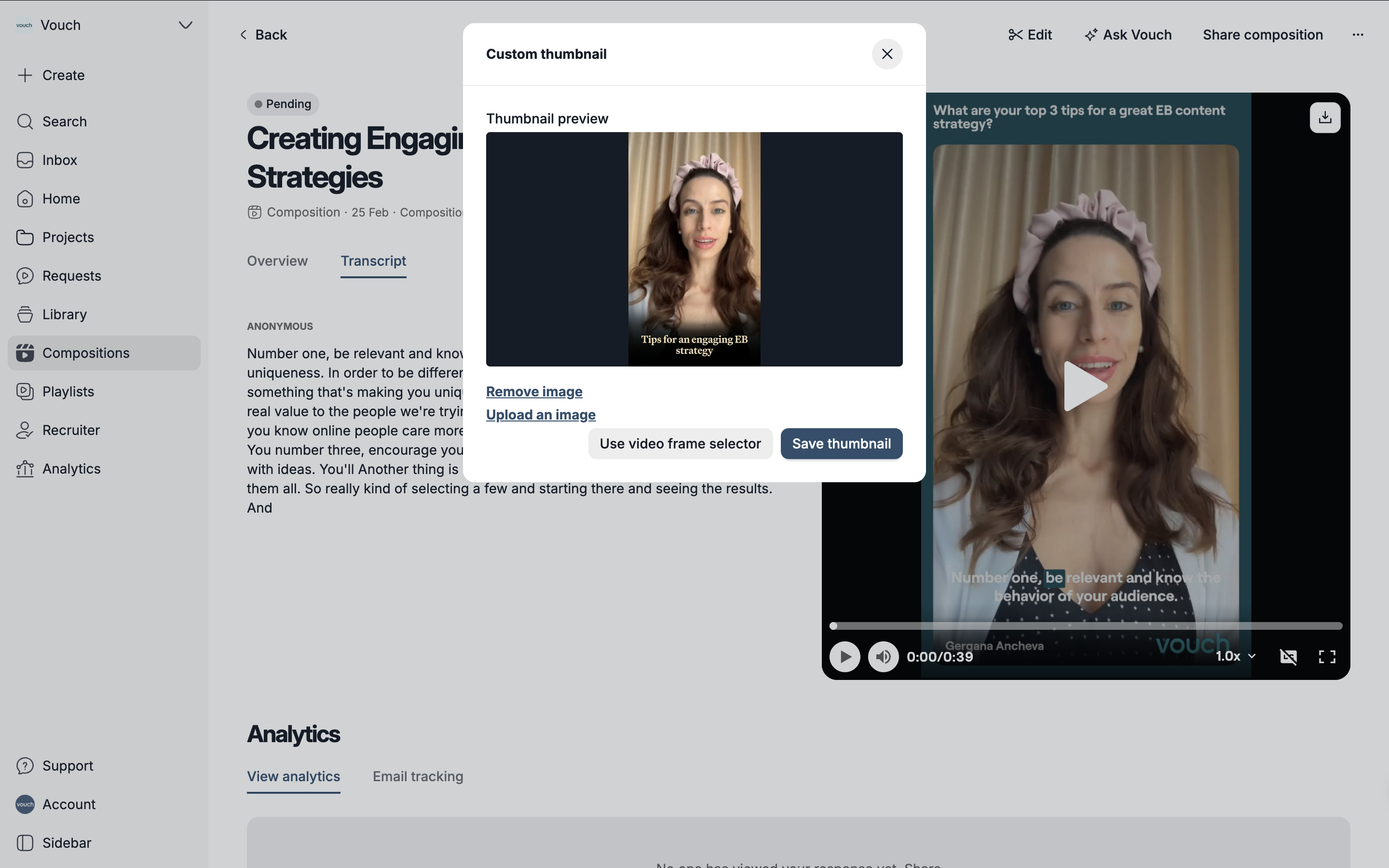 Vouch automatically sets the 1-second mark (Frame 30) as the initial thumbnail. To override this default and choose a different video frame, or to upload a custom image for your Composition: access the Composition Details page, locate the overflow menu in the top right hand corner, and select Update Thumbnail.
