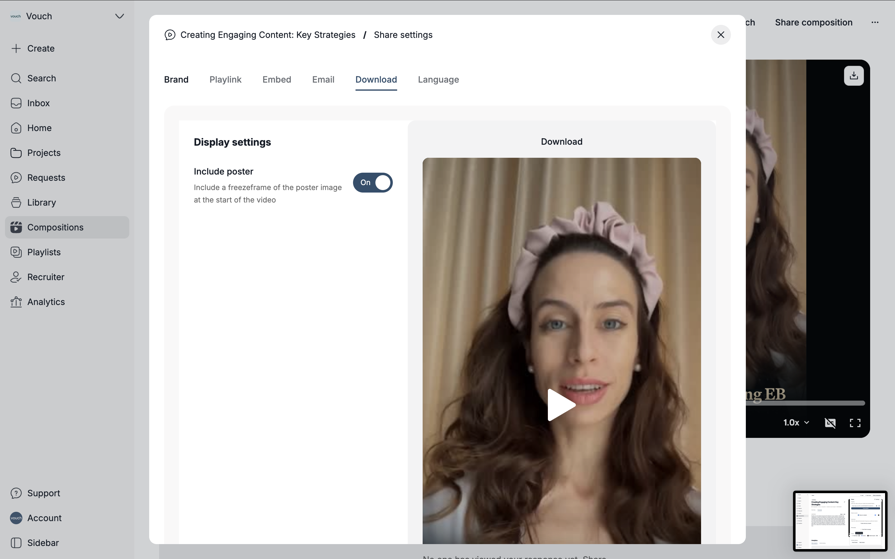 - The video poster is the static placeholder image displayed within the video player itself. It is always the first frame of your video and is permanently included (burnt in) to the respective MP4 file when downloaded from Vouch.