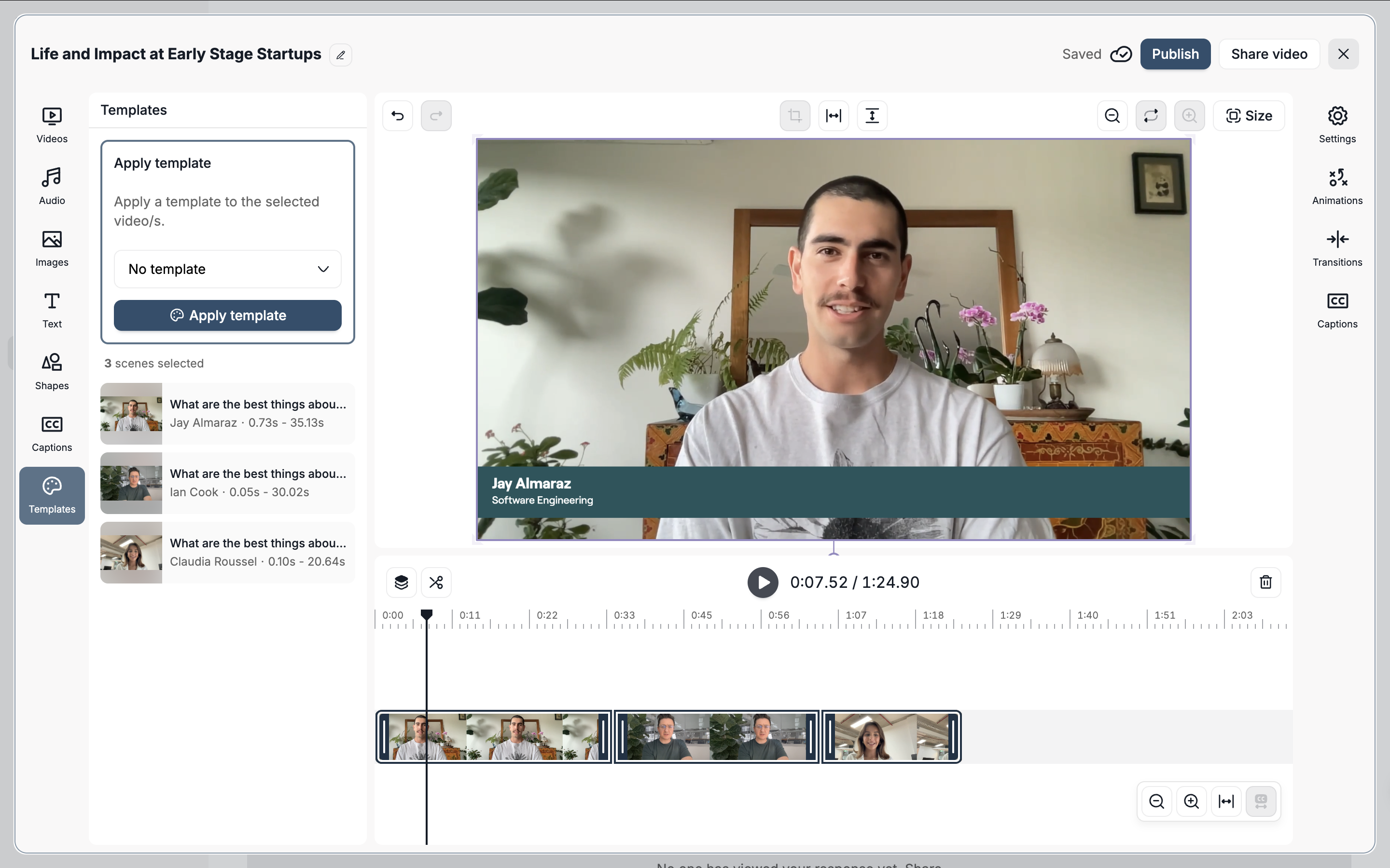 Note: Due to the way they affect the video timeline, intro and outro videos and question cards are not included when applying templates.
