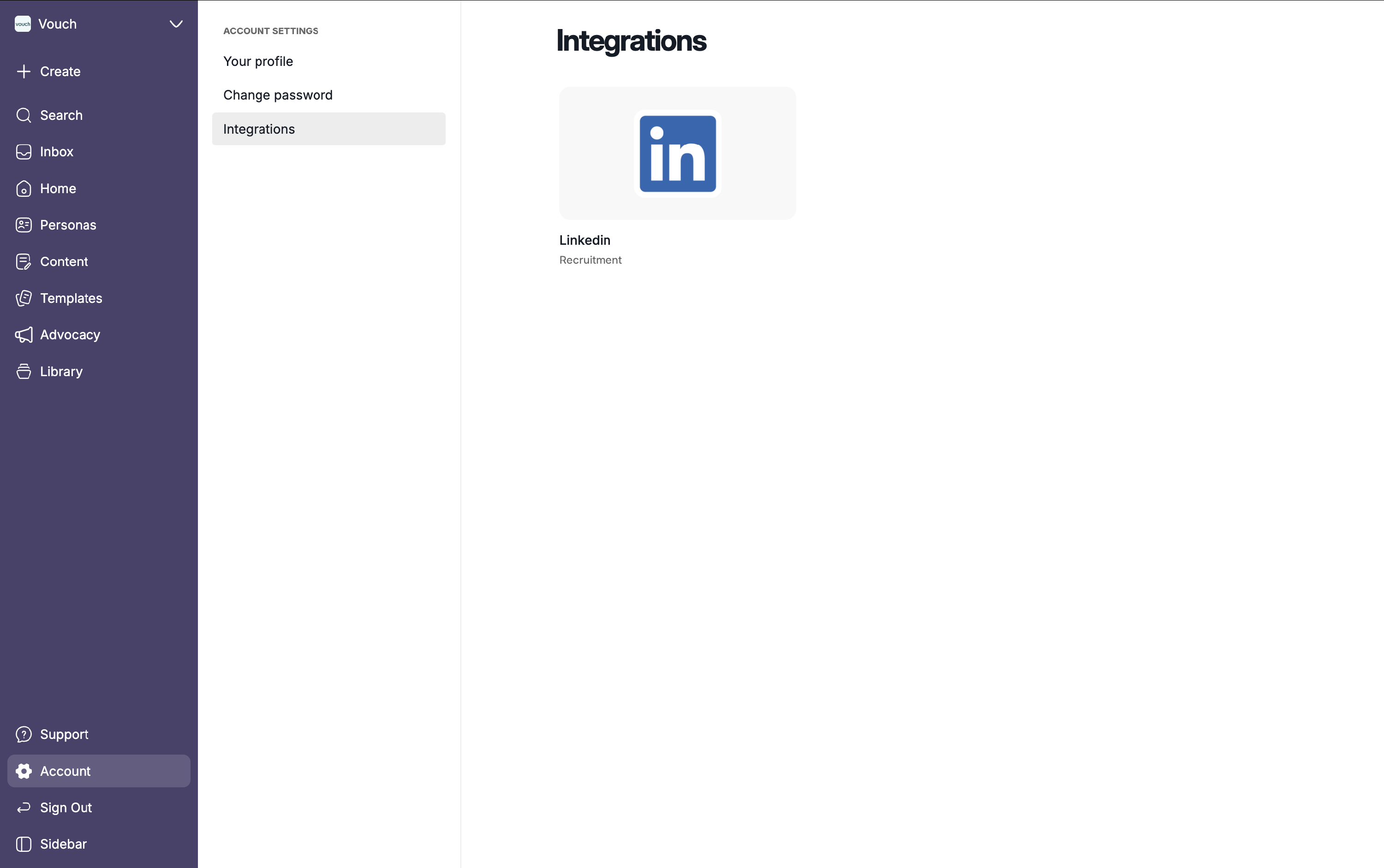 Recruiters can manage your LinkedIn connection and permissions within the Integrations tab. Here, users can authorize Vouch to share, react, or repost content on their behalf.