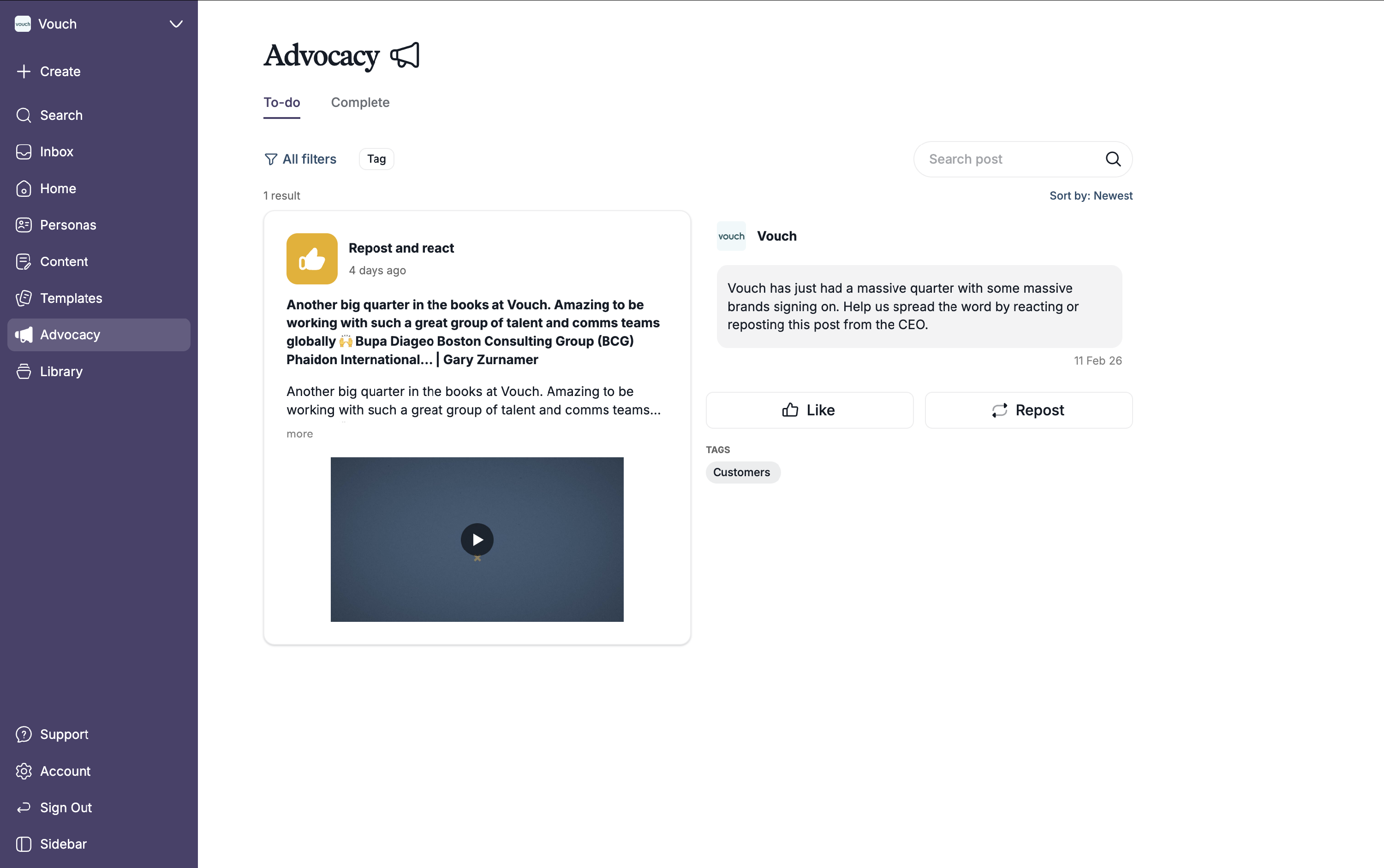 Once the advocate has liked or reposted the respective request, it will move to the complete list.