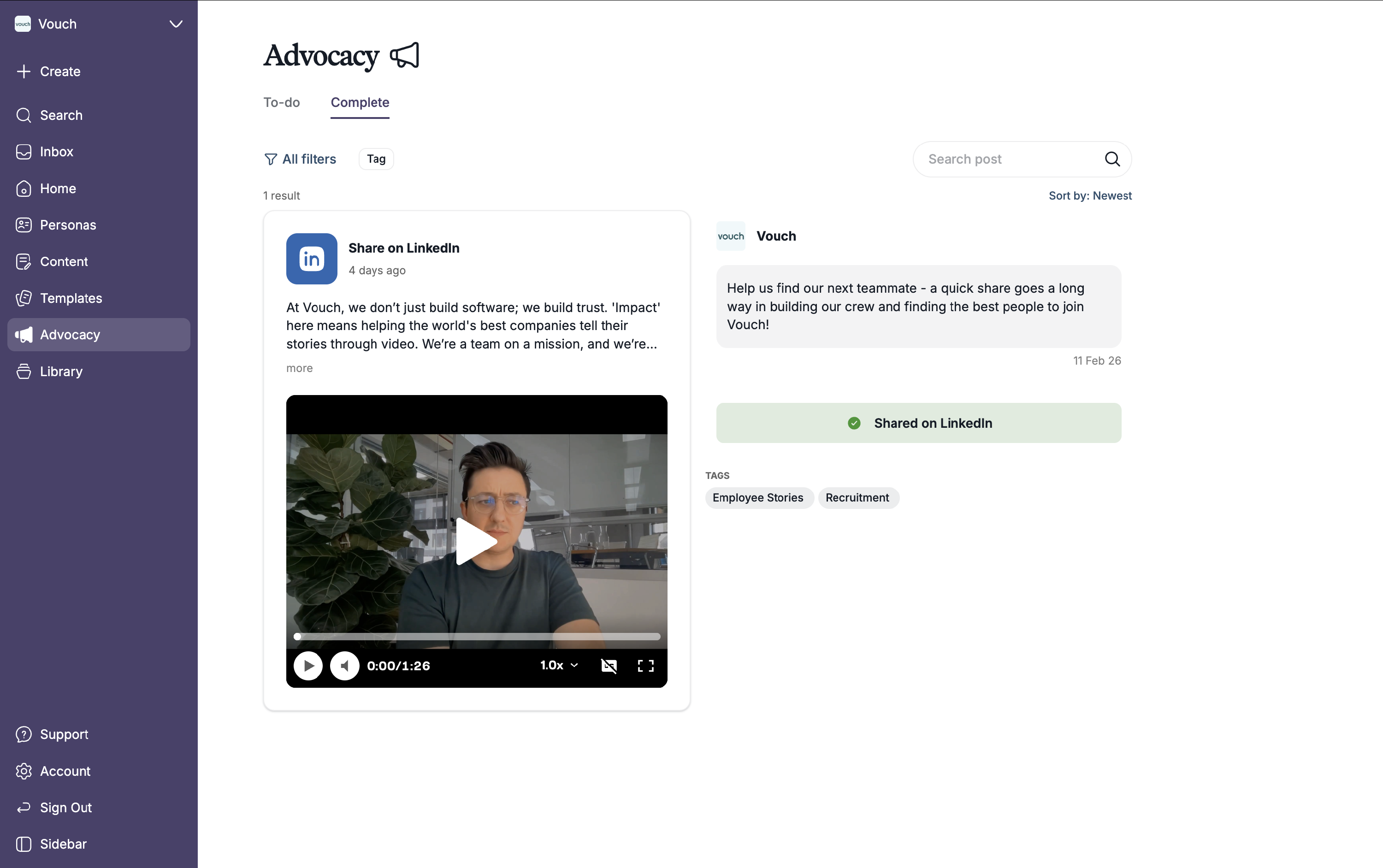 Advocacy is an optional extra that can be enabled on the Vouch Recruiter enablement portal to provide a centralised hub for recruiters to discover the latest requests from their organisation and take immediate action. The following guide outlines they key features of the Recruiter enablement portal.