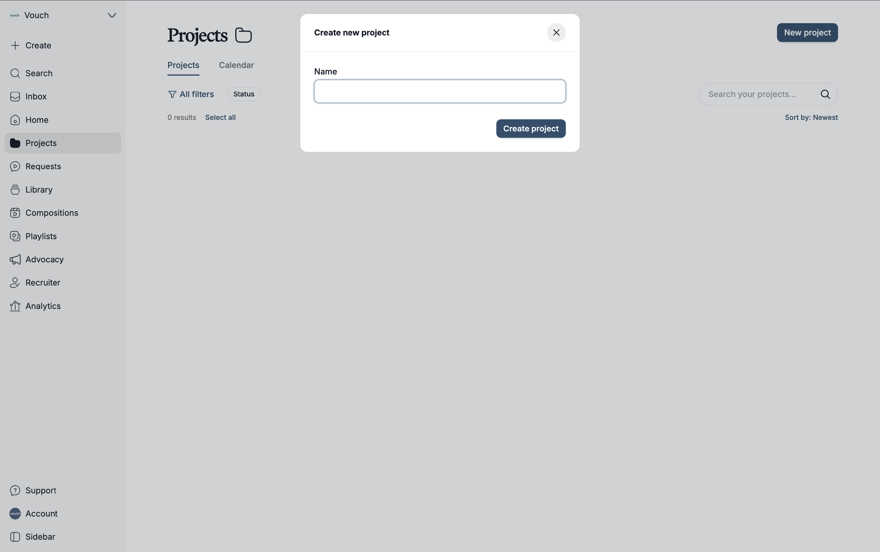 A modal will appear where you can enter your project's name. Once you’re happy with the title, click create project to begin adding content and configuring your settings.