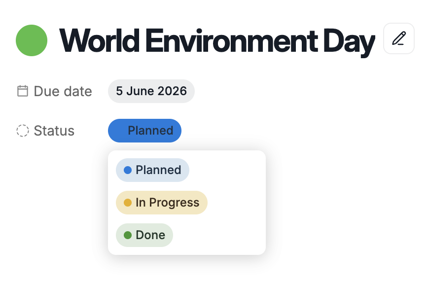 Manage your project’s lifecycle by defining its status as in-progress, planned, or done. Simply select one of these three options from the picklist to accurately reflect the project's current standing.