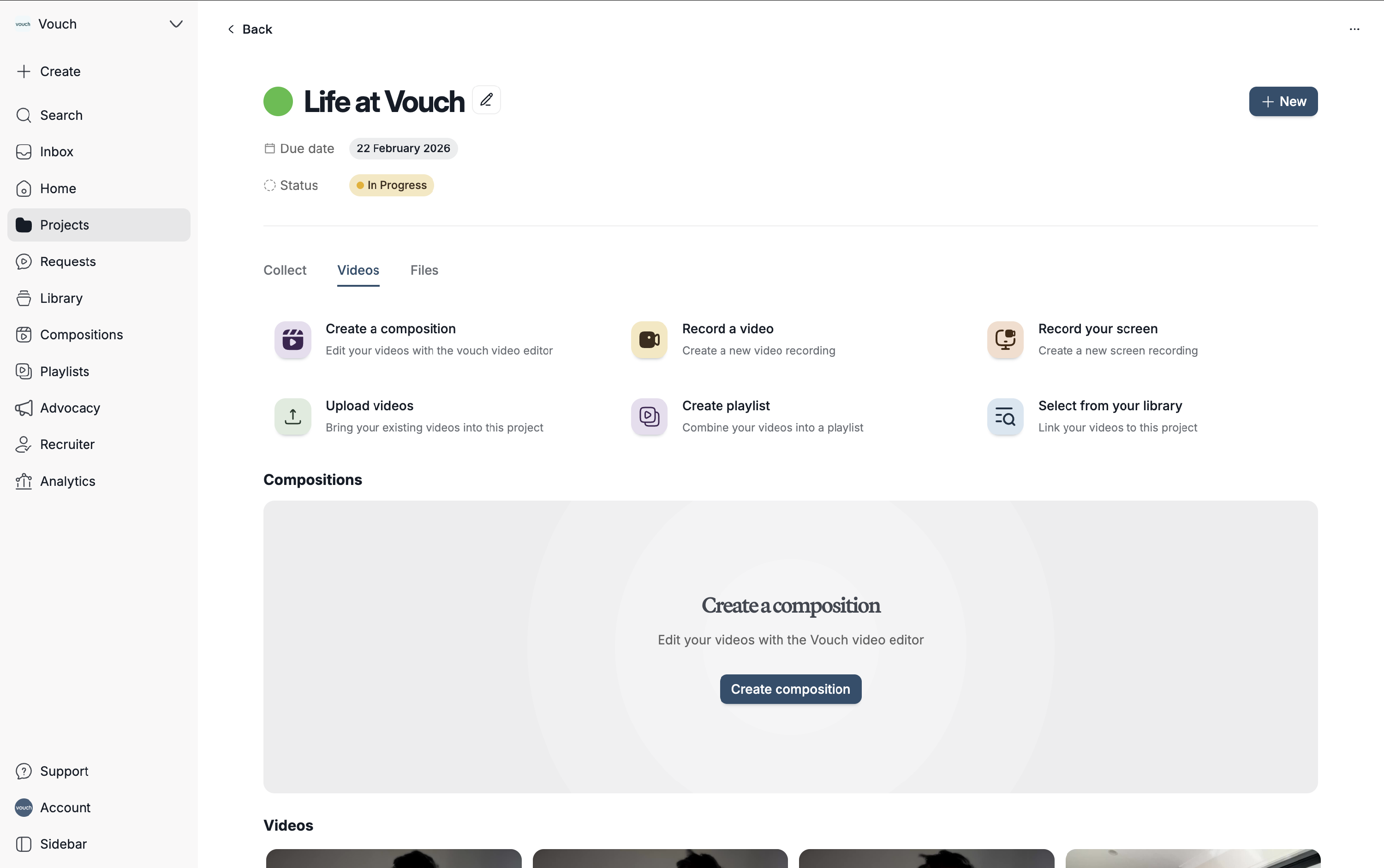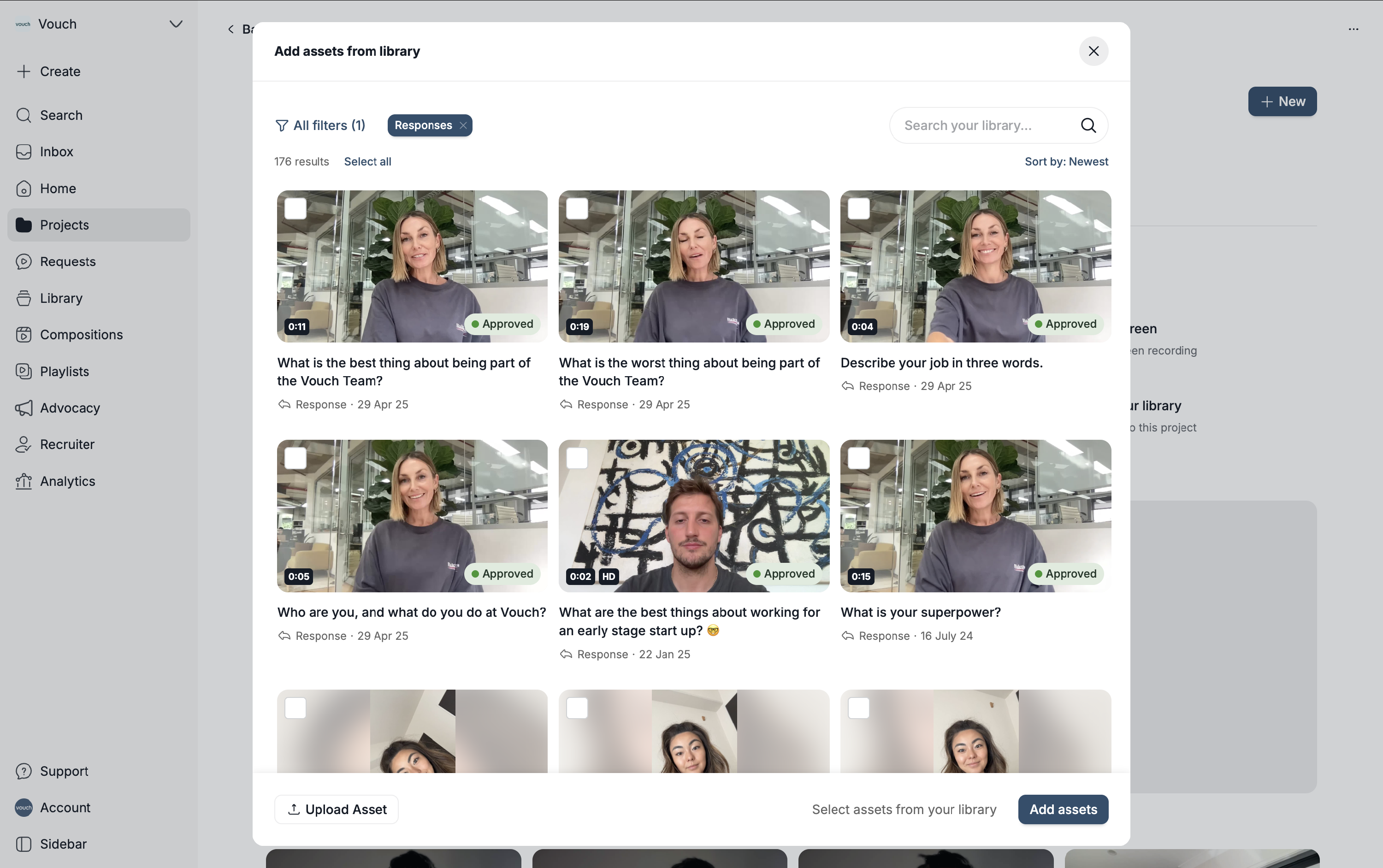 To add other videos and files to your project, simply click the respective tab within the project view and choose from the available options. Vouch allows you to upload existing files, record a new video directly, or select assets from your existing library.