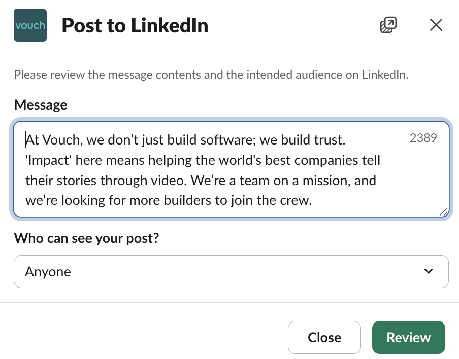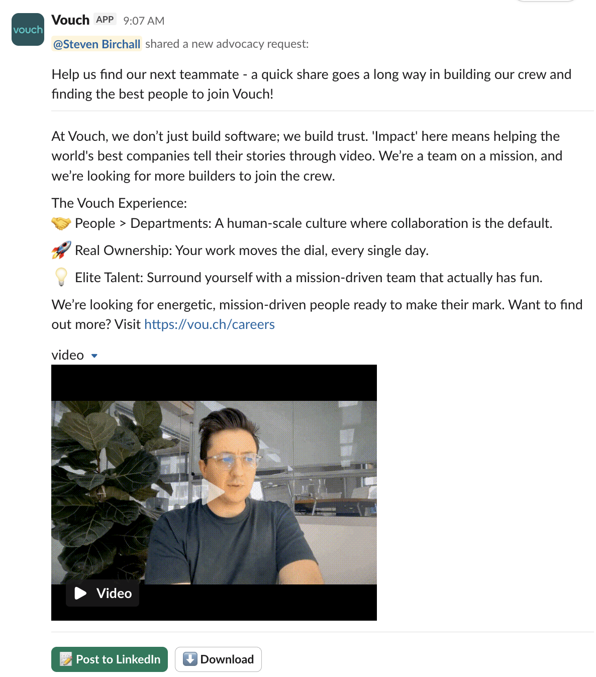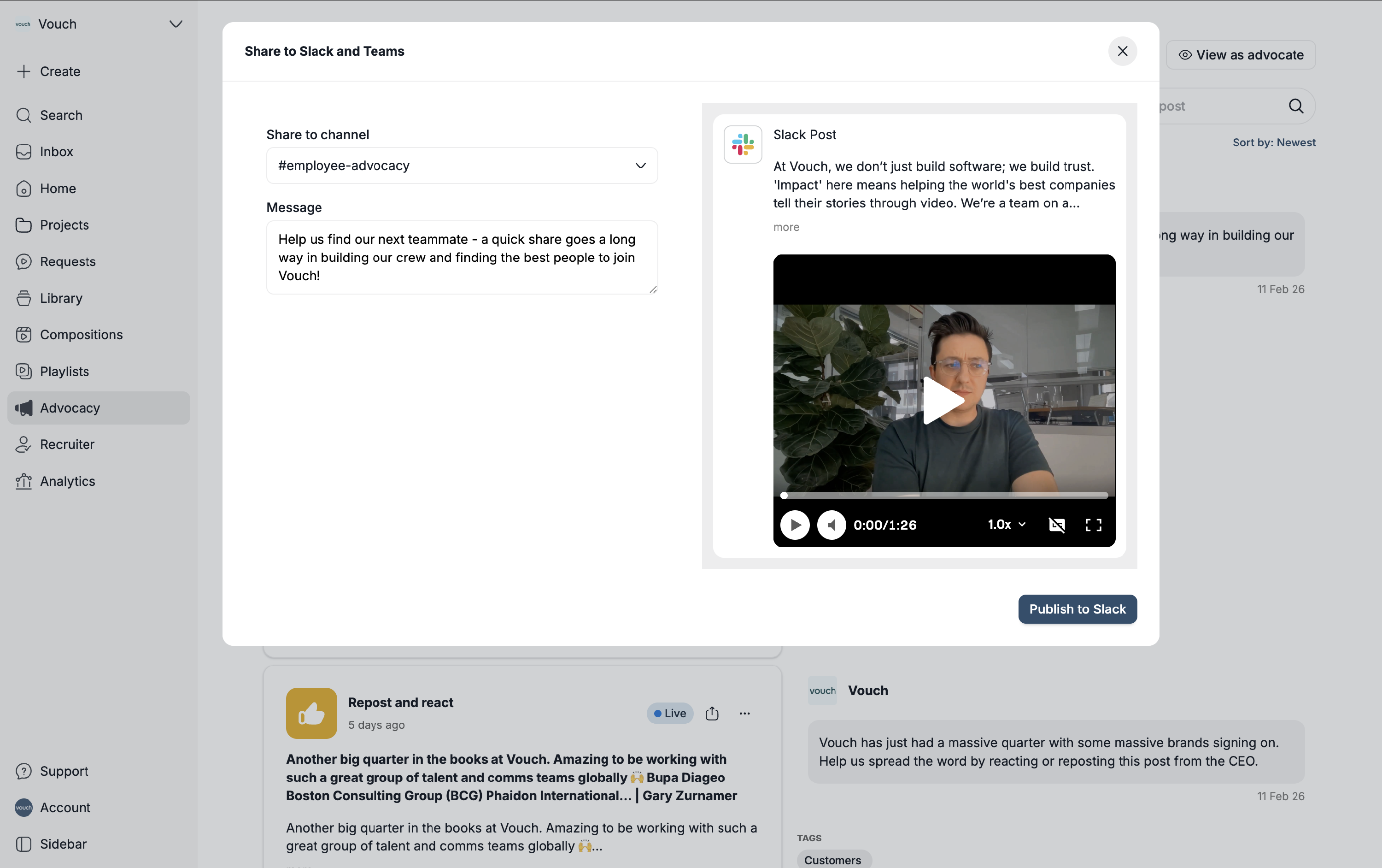 Vouch supports direct integration with Slack, allowing administrators to push advocacy requests to designated collaboration channels.