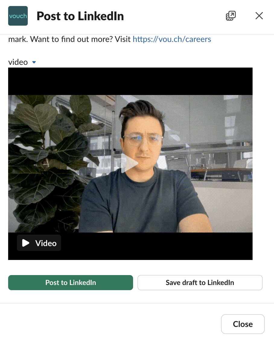 From here, users have the flexibility to post directly to LinkedIn or, if they prefer to share across other platforms, they can download the media asset to upload it manually wherever they like. When a user clicks to post to Linkedin, they'll be given the option to customise the caption and decide where they want to share the post to.